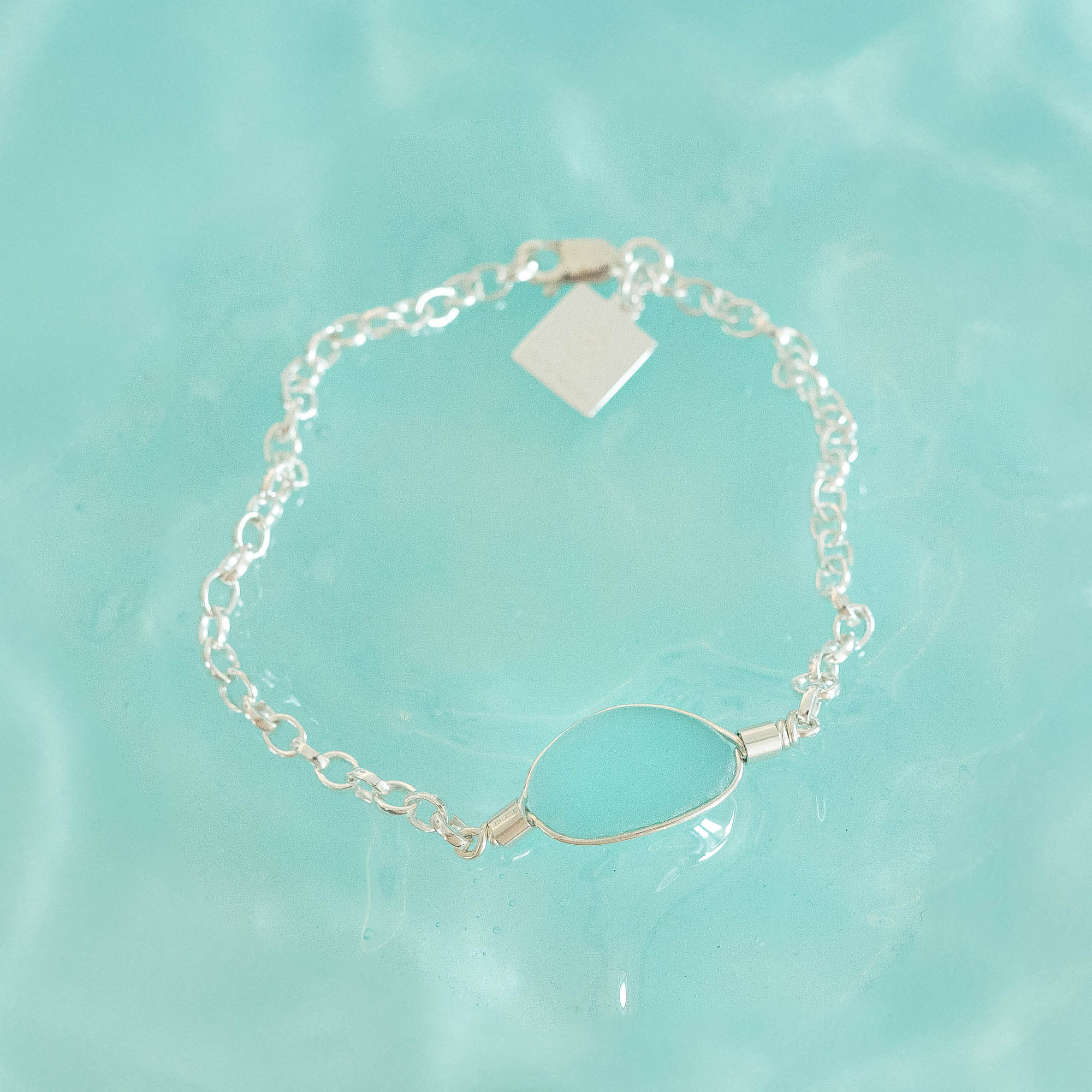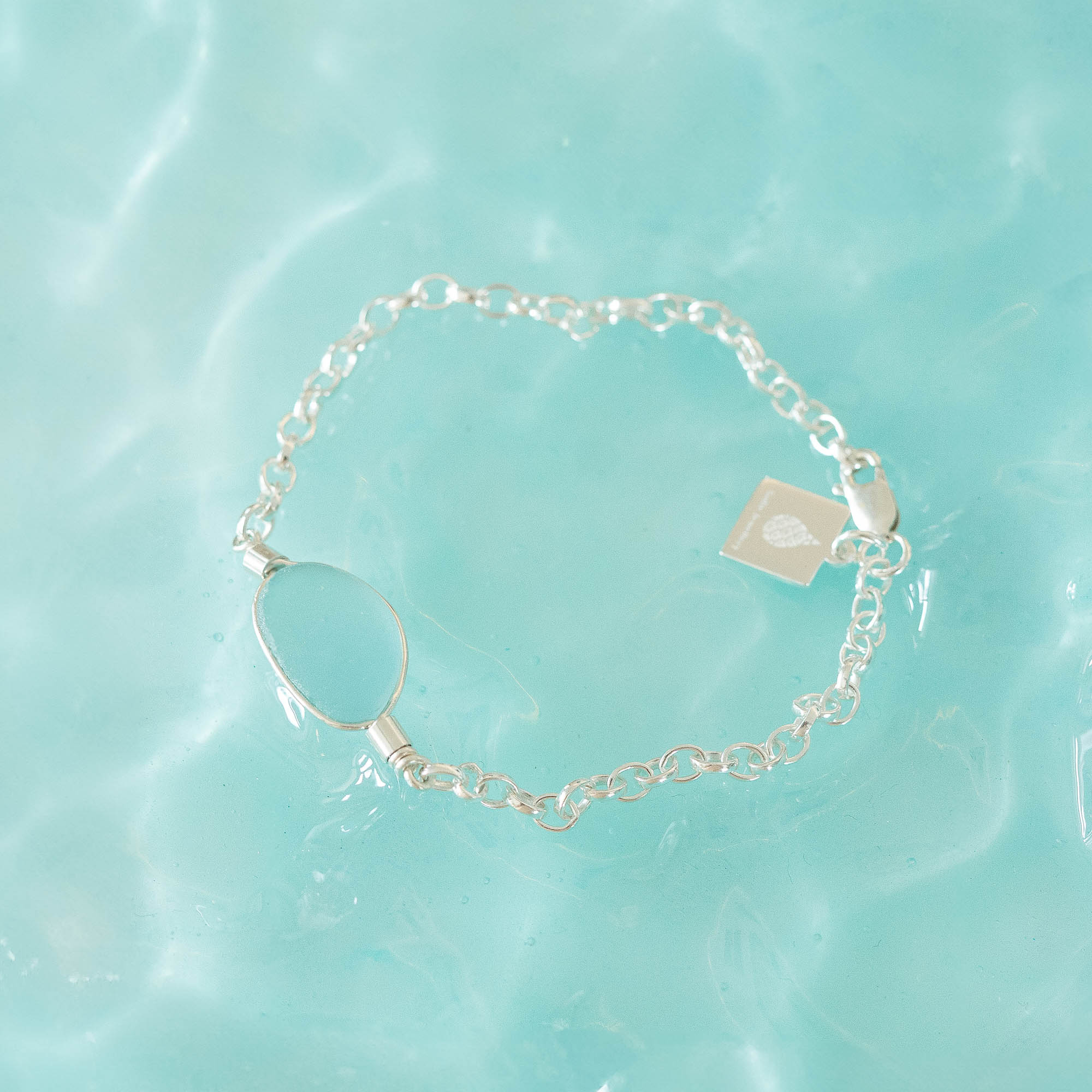 This recycled sea glass floats in a sterling silver case that has been carefully embedded around its form.