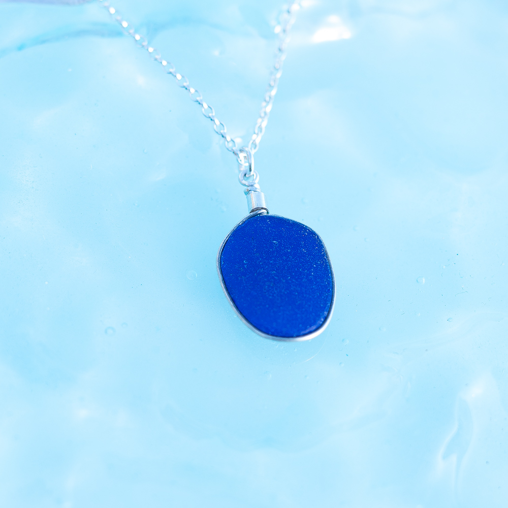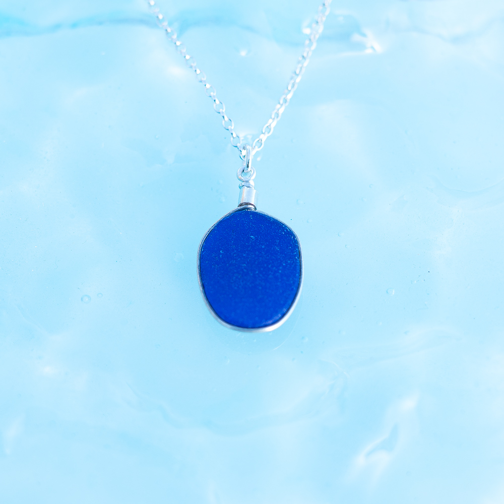 Worn by the waves, recycled from the sea. This recycled sea glass, floats in an Ecosilver case that has been carefully embedded around its form.