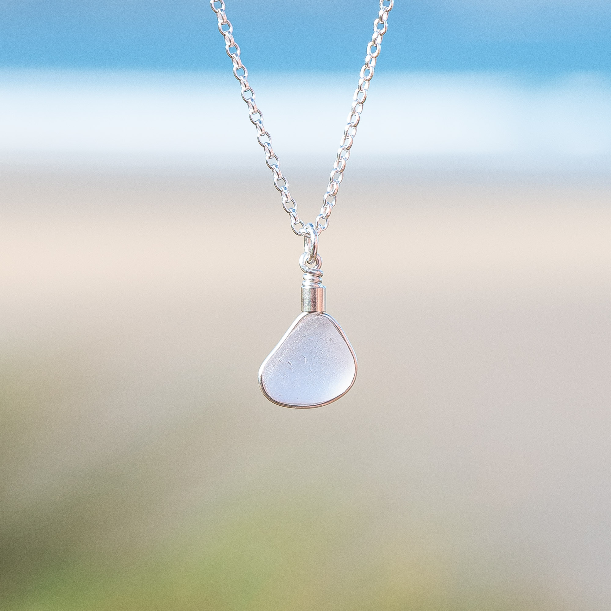 Worn by the waves, recycled from the sea. This recycled sea glass, floats in an Ecosilver case that has been carefully embedded around its form.