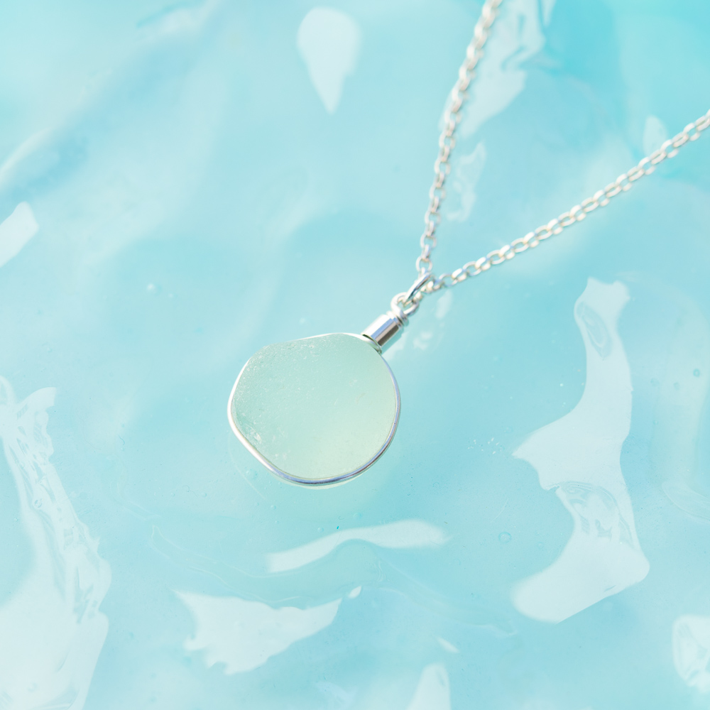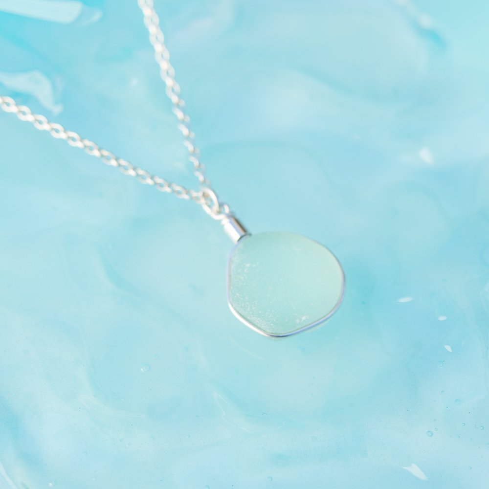 Worn by the waves, recycled from the sea. This recycled sea glass floats in an Ecosilver case that has been carefully embedded around its form, letting the sea glass be the star of the show ✨